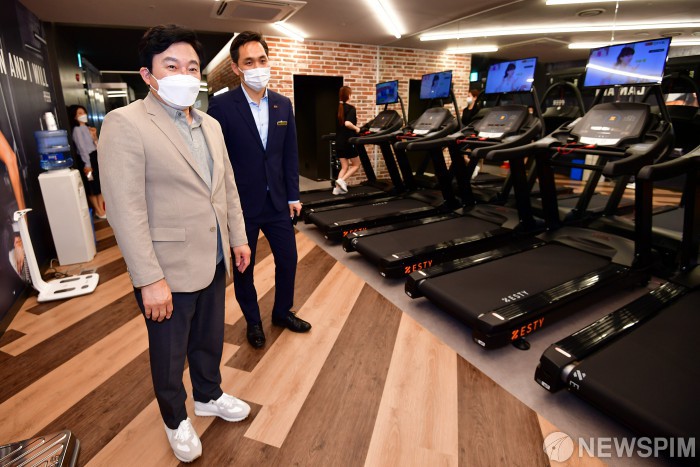 [서울=뉴스핌] 국회사진취재단 = 국민의힘 원희룡 대선 예비후보가 24일 서울 마포구 서강로의 이랜드 청년주택을 방문해 피트니스 센터 등 공동 이용시설을 둘러보고 있다. 2021.08.24 photo@newspim.com