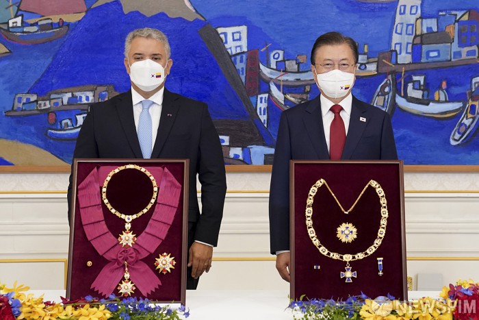 [서울=뉴스핌] 문재인 대통령이 25일 오전 청와대에서 열린 한-콜롬비아 훈장교환식에서 무궁화 대훈장과 보야카 훈장의 교환을 마치고 이반 두케 콜롬비아 대통령 기념촬영을 하고 있다. [사진=청와대] 2021.08.25 photo@newspim.com