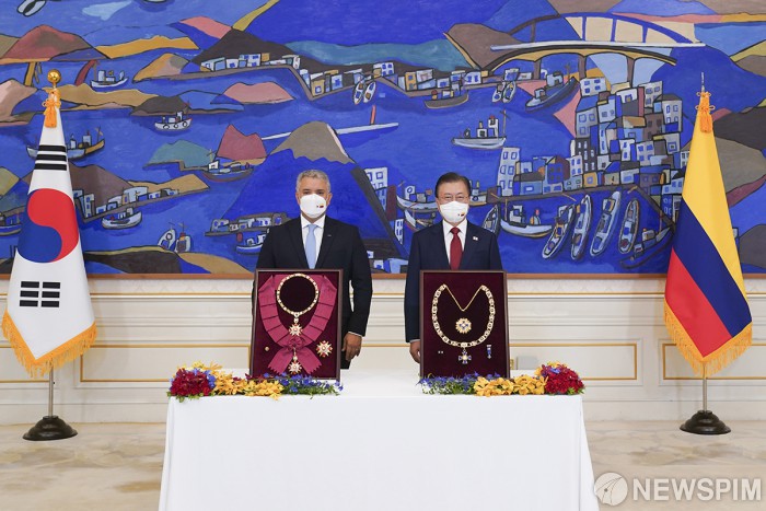 [서울=뉴스핌] 문재인 대통령이 25일 오전 청와대에서 열린 한-콜롬비아 훈장교환식에서 무궁화 대훈장과 보야카 훈장의 교환을 마치고 이반 두케 콜롬비아 대통령 기념촬영을 하고 있다. [사진=청와대] 2021.08.25 photo@newspim.com