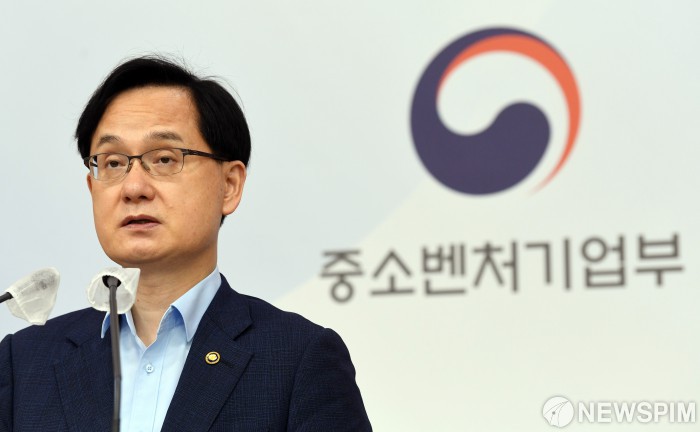 [서울=뉴스핌] 김학선 기자 = 강성천 중소벤처기업부 차관이 26일 오후 서울 종로구 정부서울청사 별관 브리핑실에서 글로벌 4대 벤처강국 도약을 위한 벤처보완대책을 발표하고 있다. 2021.08.26 yooksa@newspim.com