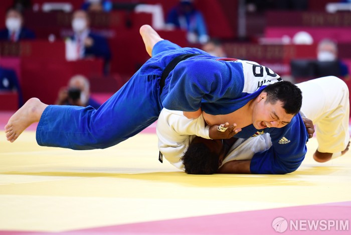 [서울=뉴스핌] 사진공동취재단 = 최광근 선수가 29일 도쿄 무도관에서 열린 2020 도쿄올림픽 남자 유도 +100kg급 동메달 결정전에서 쿠바 페르난데즈를 한판승으로 제압하고 있다. 2021.08.29 photo@newspim.com