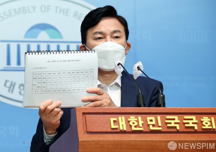 [서울=뉴스핌] 이형석 기자 = 원희룡 국민의힘 대선 예비후보가 30일 오전 국회 소통관에서 열린 기자회견에서 자신의 재산내역을 공개하고 있다. 원 후보는 이 자리에서 지난 10년간의 직계존비속 재산 변동 내역을 공개했다. 2021.08.30 leehs@newspim.com