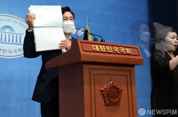 [서울=뉴스핌] 이형석 기자 = 원희룡 국민의힘 대선 예비후보가 30일 오전 국회 소통관에서 열린 기자회견에서 자신의 재산내역을 공개하고 있다. 원 후보는 이 자리에서 지난 10년간의 직계존비속 재산 변동 내역을 공개했다. 2021.08.30 leehs@newspim.com