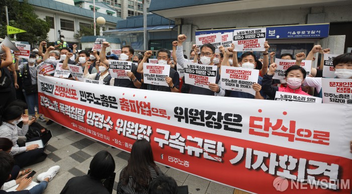 [서울=뉴스핌] 최상수 기자 = 전국민주노동조합총연맹이 2일 오전 서울 종로구 종로경찰서에서 양경수 위원장의 구속 결정에 대해 항의하는 집회를 열고 있다. 경찰은 이날 오전 5시 30분쯤 민주노총 사무실에서 양 위원장에 대한 구속영장을 집행했다. 2021.09.02 kilroy023@newspim.com