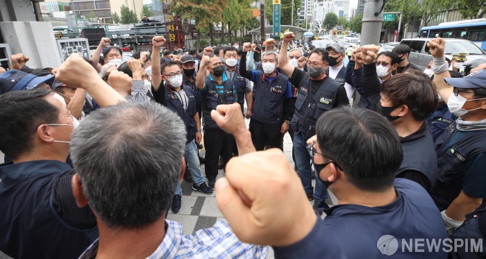 [서울=뉴스핌] 최상수 기자 = 전국민주노동조합총연맹이 2일 오전 서울 종로구 종로경찰서에서 양경수 위원장의 구속 결정에 대해 항의하는 집회를 열고 있다. 경찰은 이날 오전 5시 30분쯤 민주노총 사무실에서 양 위원장에 대한 구속영장을 집행했다. 2021.09.02 kilroy023@newspim.com