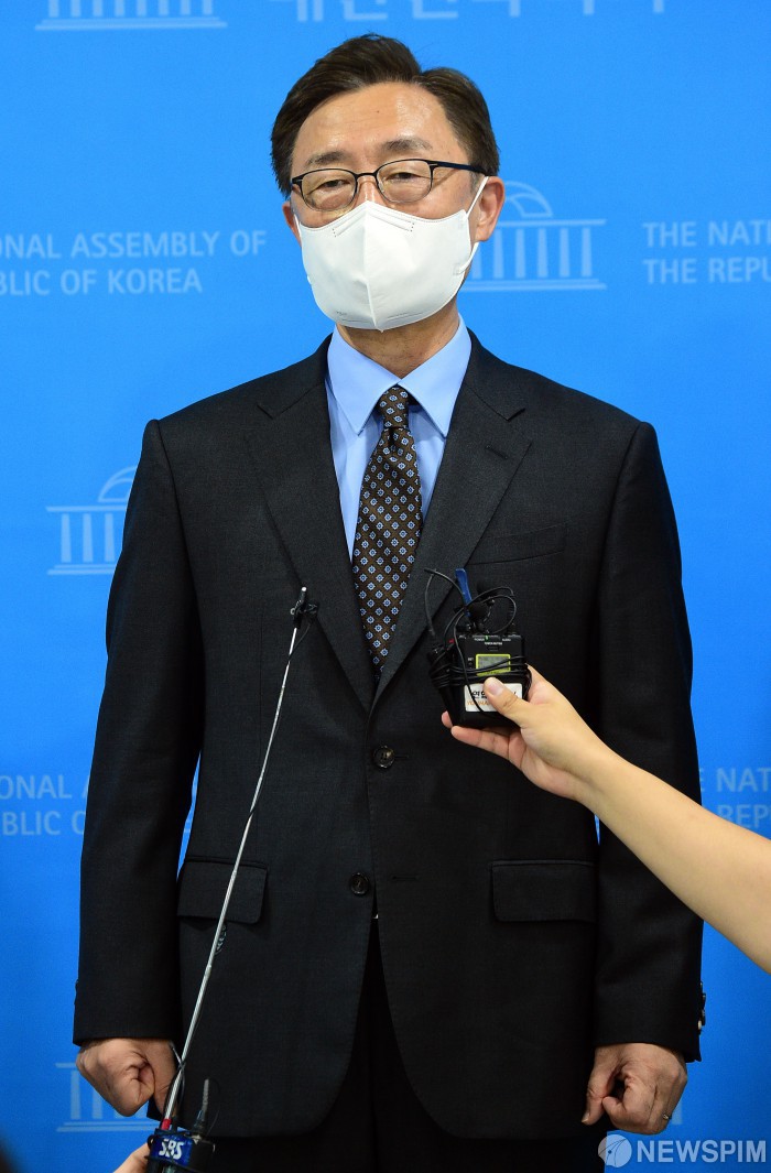 [서울=뉴스핌] 이형석 기자 = 국민의힘 대선 예비후보인 최재형 전 감사원장이 3일 국회 소통관에서 검찰의 청부고발 의혹에 대한 입장문 발표를 마친 뒤 취재진의 질문에 답하고 있다. 2021.09.03 leehs@newspim.com