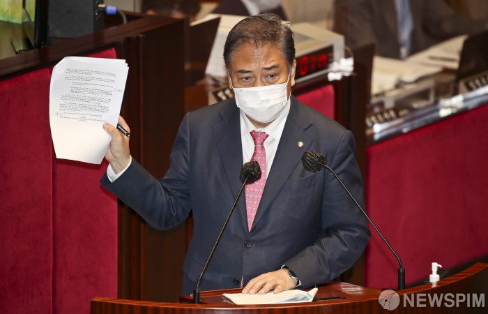 [서울=뉴스핌] 이형석 기자 = 박진 국민의힘 의원이 7일 오전 서울 여의도 국회에서 열린 예산결산특별위원회 전체회의에서 질의 중 언론중재법 관련 유엔 서한을 들어보이고 있다. 2021.09.07 leehs@newspim.com