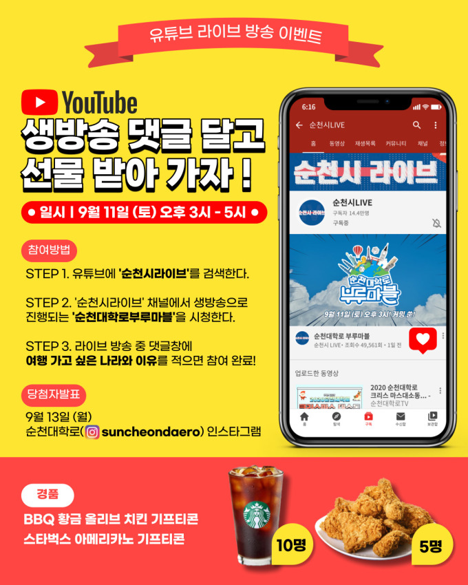 순천시 유튜브 채널을 통해 생중계되며, 프로그램에 직접 참여하지 않더라도 실시간으로 진행되는 댓글 추첨 이벤트에 참여할 수 있다.