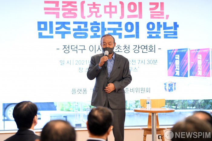 [서울=뉴스핌] 이형석 기자 = 송민순 전 외교통상부 장관이 13일 오전 서울 여의도의 한 카페에서 열린 '극중의 길, 민주공화국의 앞날' 강연회에서 축사를 하고 있다. 2021.09.13 leehs@newspim.com