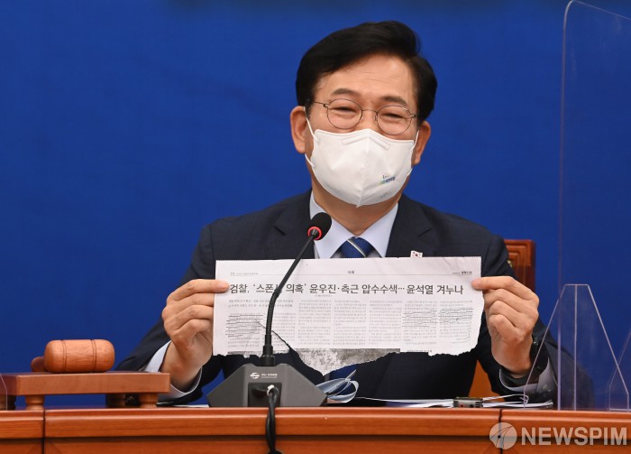 [서울=뉴스핌] 이형석 기자 = 송영길 대표가 13일 오전 국회에서 열린 더불어민주당 최고위원회의에서 모두 발언중 모 일간지 기사를 들어 보이며 발언하고 있다. 2021.09.13 leehs@newspim.com