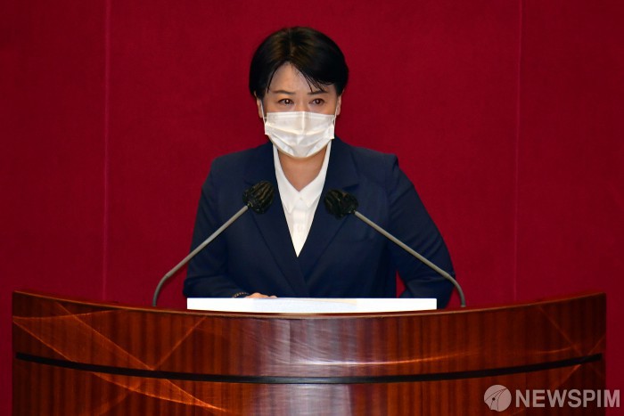 [서울=뉴스핌] 이형석 기자 = 윤희숙 국민의힘 의원이 13일 국회에서 열린 본회의에서 본인의 사직안 상정 전에 신상발언을 하고 있다. 2021.09.13 leehs@newspim.com