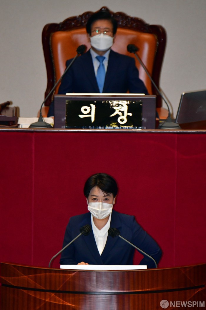 [서울=뉴스핌] 이형석 기자 = 윤희숙 국민의힘 의원이 13일 국회에서 열린 본회의에서 본인의 사직안 상정 전에 신상발언을 하고 있다. 2021.09.13 leehs@newspim.com