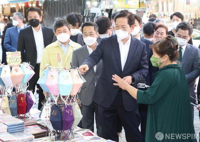 [서울=뉴스핌] 국회사진취재단 = 추석을 앞둔 16일 오전 송영길 더불어민주당 당대표가 서울 중구 남대문 시장을 방문, 악세서리가게에서 물건을 구매하고 있다. 2021.09.16 photo@newspim.com