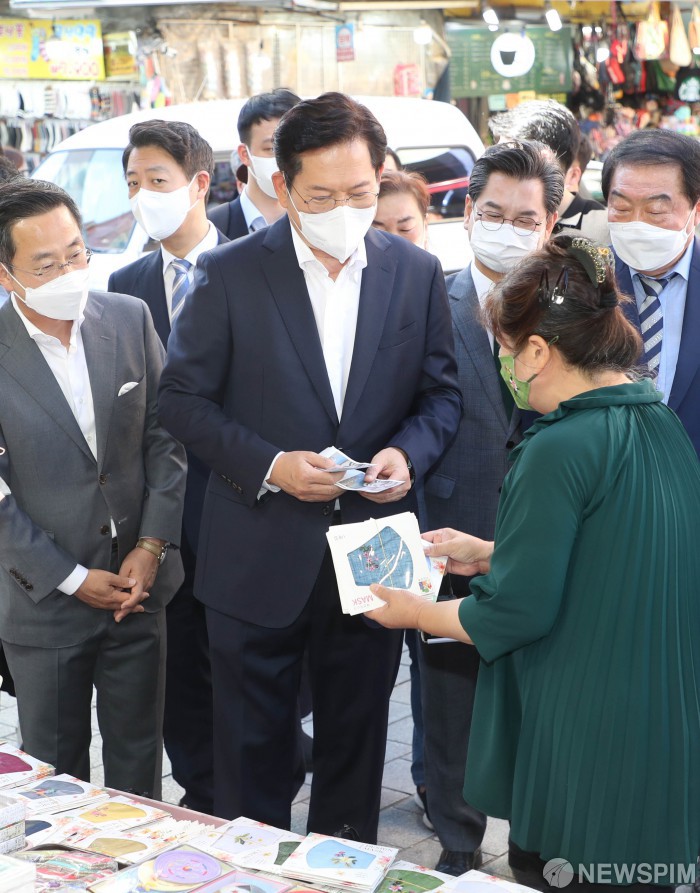 [서울=뉴스핌] 국회사진취재단 = 추석을 앞둔 16일 오전 송영길 더불어민주당 당대표가 서울 중구 남대문 시장을 방문, 악세서리가게에서 물건을 구매하고 있다. 2021.09.16 photo@newspim.com