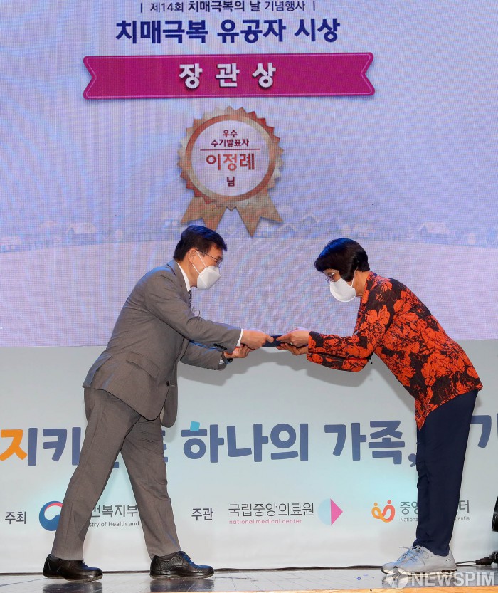 [서울=뉴스핌] 권덕철 보건복지부 장관이 16일 오전 서울 중구 세종대로 대한상공회의소에서 열린 제14회 치매 극복의 날 기념식에서 유공자 시상을 하고 있다. [사진= 보건복지부 ] 2021.09.16 photo@newspim.com