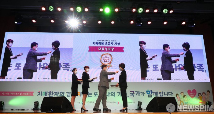 [서울=뉴스핌] 권덕철 보건복지부 장관이 16일 오전 서울 중구 세종대로 대한상공회의소에서 열린 제14회 치매 극복의 날 기념식에서 유공자 시상을 하고 있다. [사진= 보건복지부] 2021.09.16 photo@newspim.com