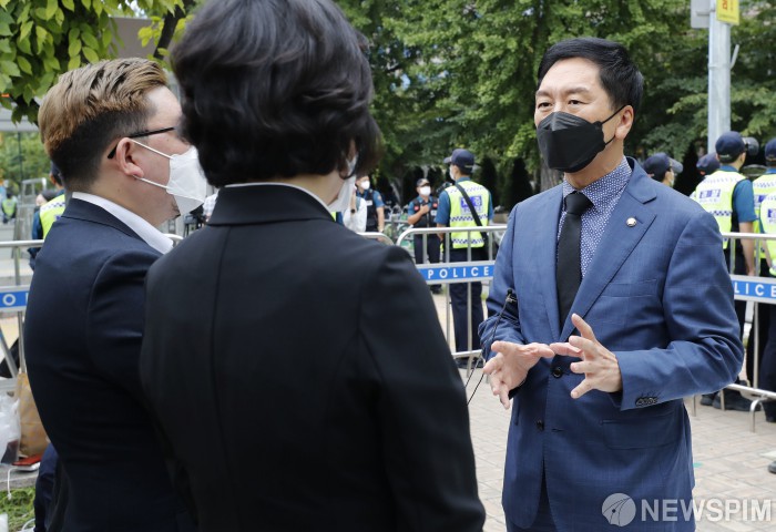 [서울=뉴스핌] 이형석 기자 = 김기현 국민의힘 원내대표가 17일 서울 여의도 국회 앞에 마련된 자영업자 합동분향소를 찾아 헌화한 뒤 자영업자 비상대책위 관계자와 대화하고 있다. 2021.09.17 leehs@newspim.com
