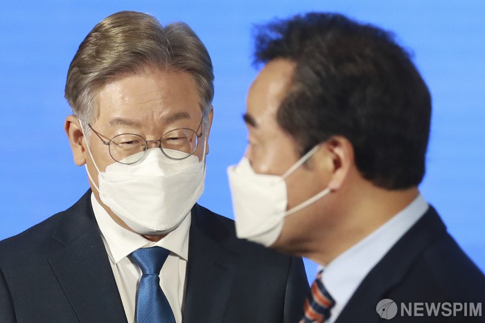 [광주=뉴스핌] 이형석 기자 = 이재명 더불어민주당 대선 경선 후보(왼쪽)가 25일 오후 광주 서구 김대중컨벤션센터에서 열린 제20대 대통령 선거 후보자 선출을 위한 광주·전남 지역 합동연설회를 마치고 이낙연 후보 곁을 지나고 있다. 2021.09.25 leehs@newspim.com