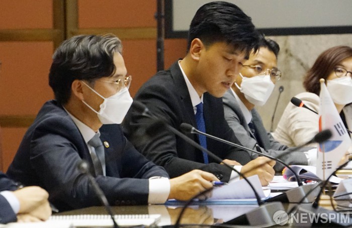 [서울=뉴스핌]박진규 산업통상자원부 1차관이 27일 오후 (현지시간) 이탈리아 로마 경제개발부 회의실에서 알레산드라 토데(Alessandra Todde) 이탈리아 경제개발부 차관과 면담을 갖고 있다.[사진=산업통상자원부 ] 2021.09.28 photo@newspim.com