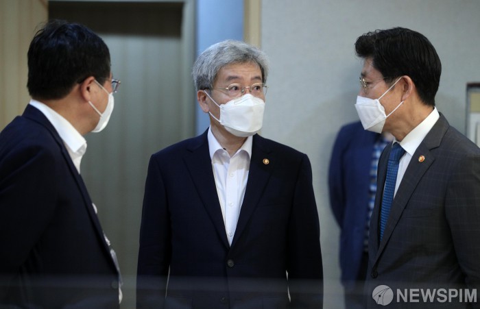 [서울=뉴스핌] 김학선 기자 = 노형욱 국토교통부 장관(오른쪽부터)과 고승범 금융위원장, 안일환 청와대 경제수석이 29일 서울 종로구 정부서울청사에서 열린 제31차 부동산시장 점검 관계장관회의에 앞서 대화하고 있다. 2021.09.29 yooksa@newspim.com