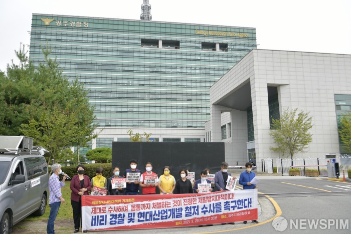 [광주=뉴스핌] 전경훈 기자 = 29일 오전 광주경찰청 앞에서 '학동참사 시민대책위원회'가 현대산업개발과 재개발조합 비리, 정관계 인사 연루 의혹에 대한 엄정 수사를 촉구하고 있다. 2021.09.29 kh10890@newspim.com