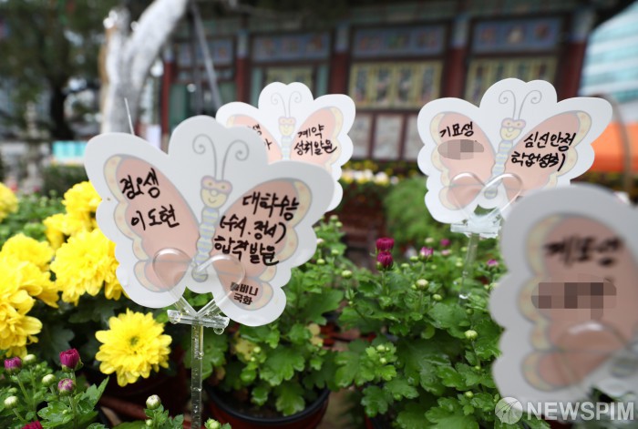 [서울=뉴스핌] 정일구 기자 = 2022학년도 대학수학능력시험을 50일 앞둔 29일 오후 서울 종로구 조계사에 수능 응원 글귀가 적힌 소원지가 꽂혀 있다. 2021.09.29 mironj19@newspim.com