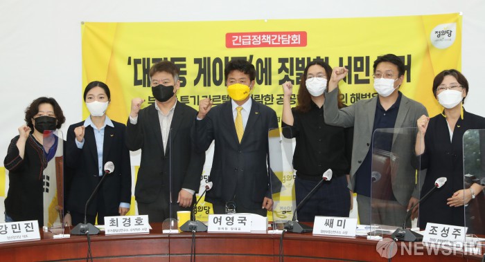 [서울=뉴스핌] 이형석 기자 = 정의당 여영국 대표를 비롯한 참석자들이 7일 국회에서 열린 '대장동 게이트에 짓밟힌 서민 주거, 부동산 투기 카르텔로 전락한 공공개발사업의 해법은?' 긴급 정책간담회에서 '서민주거 지켜내자' 구호를 외치고 있다. 2021.10.07 leehs@newspim.com