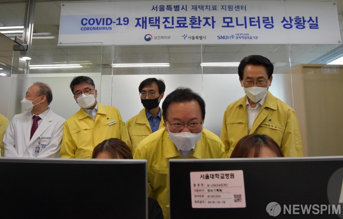 [서울=뉴스핌] 윤창빈 기자 = 김부겸 국무총리가 8일 코로나19 방역현장 점검하기 위해 서울 종로구 서울대병원 재택치료지원센터를 방문, 의료진을 격려하고 있다. 2021.10.08 pangbin@newspim.com