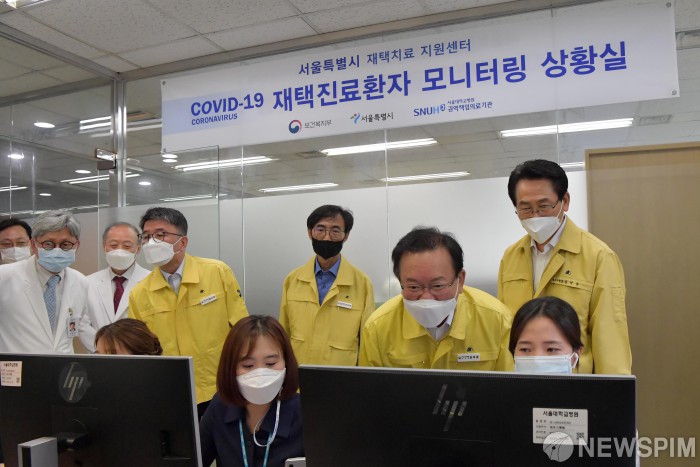 [서울=뉴스핌] 윤창빈 기자 = 김부겸 국무총리가 8일 코로나19 방역현장 점검하기 위해 서울 종로구 서울대병원 재택치료지원센터를 방문, 의료진을 격려하고 있다. 2021.10.08 pangbin@newspim.com