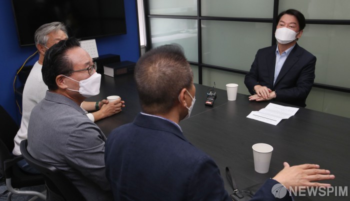 [서울=뉴스핌] 최상수 기자 = 11일 안철수 국민의당 대표가 종로빌딩 국민노동조합 사무실을 찾아 대표자들과 인사를 나누고 있다. 오른쪽부터 시계방향으로 안 대표, 강계명 한국상점가경영자연합회장, 이희범 국민노동조합 위원장, 김준용 국민노동조합 사무총장. 2021.10.11 kilroy023@newspim.com