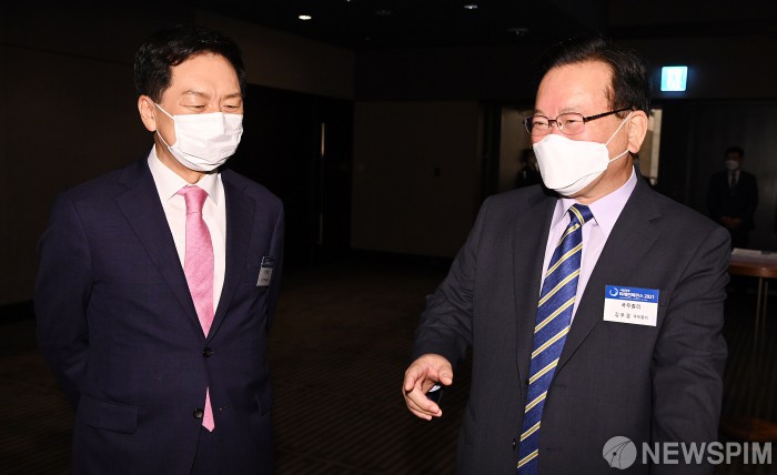 [서울=뉴스핌] 국회사진취재단 = 김부겸(오른쪽) 국무총리와 김기현 국민의힘 원내대표가 13일 서울 중구 신라호텔에서 열린 '미래컨퍼런스 2021'에 참석해 컨퍼런스 시작 전 환담을 하고 있다. 2021.10.13 photo@newspim.com
