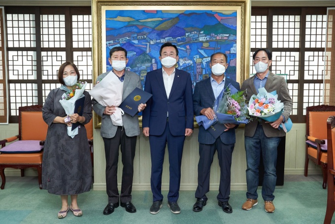 | 강석주 통영시장(가운데)이 13일 시청에서 모범 이장 및 통장 등 4명에게 경남도지사 표창장을 전수하고 기념사진을 찍고 있다.[사진=통영시] 2021.10.14 news2349@newspim.com |