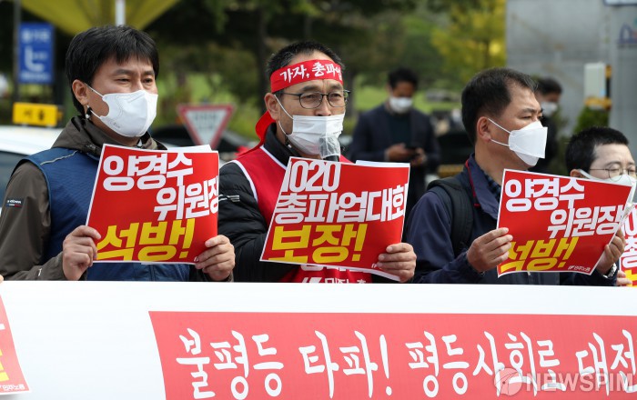 [서울=뉴스핌] 정일구 기자 = 민주노총 관계자들이 19일 오전 서울 서초구 서울중앙지방법원 앞에서 총파업대회 보장과 양경수 위원장 석방 촉구 기자회견을 하고 있다. 2021.10.19 mironj19@newspim.com
