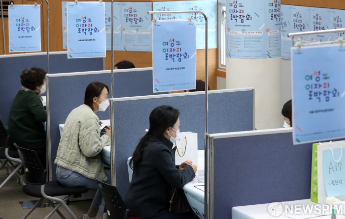 [서울=뉴스핌] 정일구 기자 = 19일 오후 서울 마포구 중부여성발전센터에서 열린 2021 서울시 여성일자리박람회를 찾은 구직자들이 취업 상담을 받고 있다. 2021.10.19 mironj19@newspim.com