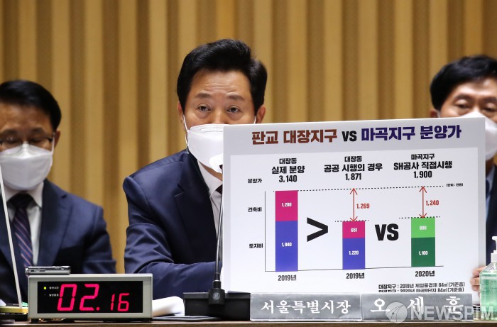 [서울=뉴스핌] 국회사진취재단 = 오세훈 서울시장이 20일 서울시청에서 열린 국회 국토교통위원회의 서울시 국정감사에서 판교 대장지구와 마곡지구 분양가 관련 피켓을 들어보이며 답변하고 있다. 2021.10.20 photo@newspim.com