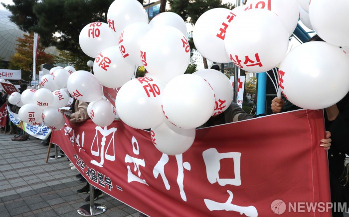 [서울=뉴스핌] 국회사진취재단 = 22일 오후 국민의힘 대선 경선 제6차 토론회 2차 맞수토론이 열린 서울 마포구 YTN뉴스퀘어 앞에서 윤석열 후보 지지자들이 후보 도착을 기다리고 있다. 2021.10.22 photo@newspim.com