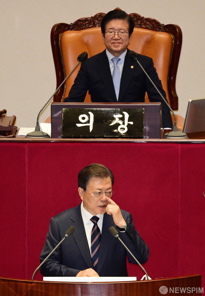 [서울=뉴스핌] 최상수 기자 = 문재인 대통령이 25일 국회 본회의장에서 2022년도 예산안 시정연설을 하고 있다. 2021.10.25 kilroy023@newspim.com