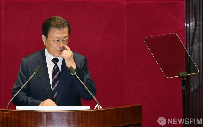 [서울=뉴스핌] 최상수 기자 = 문재인 대통령이 25일 국회 본회의장에서 2022년도 예산안 시정연설을 하고 있다. 2021.10.25 kilroy023@newspim.com