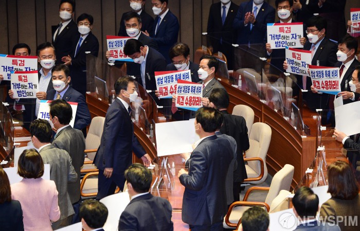 [서울=뉴스핌] 최상수 기자 = 국민의힘 의원들이 25일 국회 본회의장에서 열린 문재인 대통령 국회 본회의장에서 2022년도 예산안 시정연설을 마친 뒤 퇴장하는 문 대통령에게 대장동 특검을 요구하는 손피켓을 들어보이고 있다. 2021.10.25 kilroy023@newspim.com