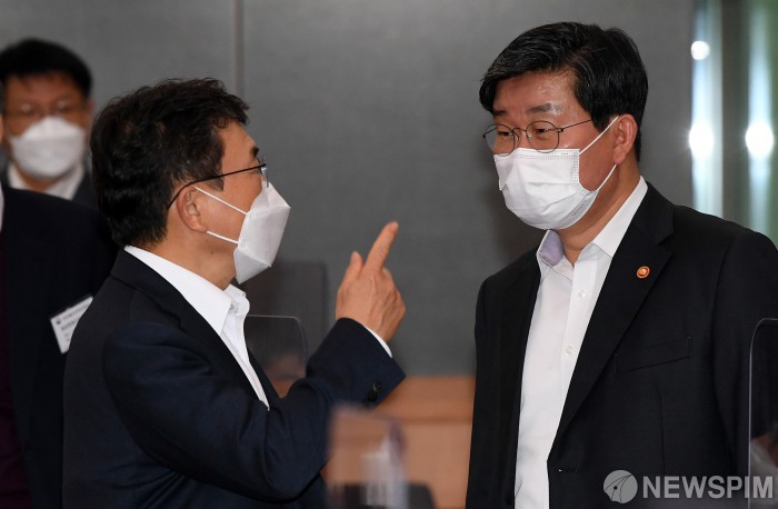 [서울=뉴스핌] 김학선 기자 = 전해철 행정안전부 장관과 권덕철 보건복지부 장관이 27일 오후 서울 종로구 정부서울청사 별관에서 열린 제3차 코로나19 일상회복지원위원회에서 대화를 나누고 있다. 2021.10.27 yooksa@newspim.com
