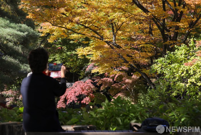 [서울=뉴스핌] 황준선 인턴기자 = 맑은 날씨를 보인 28일 오후 서울 성북구 길상사를 찾은 시민들이 가을빛으로 물들어가는 단풍들을 보며 즐거운 시간을 보내고 있다. 2021.10.28 hwang@newspim.com