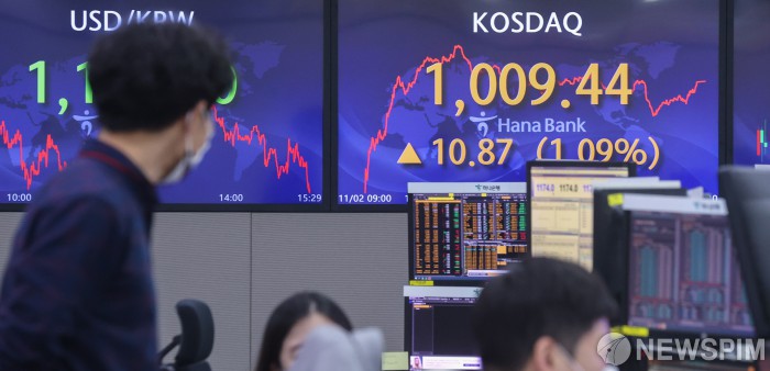 [서울=뉴스핌] 최상수 기자 = 2일 코스피가 전 거래일(2978.94)보다 34.55포인트(1.16%) 오른 3013.49에 장을 마쳤다. 코스닥지수는 전 거래일(998.57)보다 10.87포인트(1.09%) 상승한 1009.44에 거래를 마쳤고, 원·달러 환율은 전 거래일(1176.5)보다 2.1원 내린 1174.4원에 마감했다. 사진은 이날 오후 하나은행 딜링룸 모습. 2021.11.02 kilroy023@newspim.com