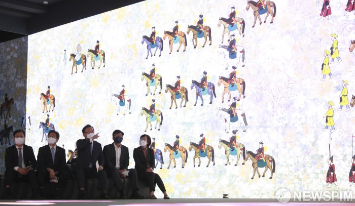 [서울=뉴스핌] 이형석 기자 = 김부겸 국무총리(왼쪽 세번째)가 3일 오후 서울 용산구 국립중앙박물관에서 열린 제7차 콘텐츠산업진흥위원회를 앞두고 전시장 내에 마련된 디지털 실감 영상관을 점검하고 있다. 2021.11.03 leehs@newspim.com
