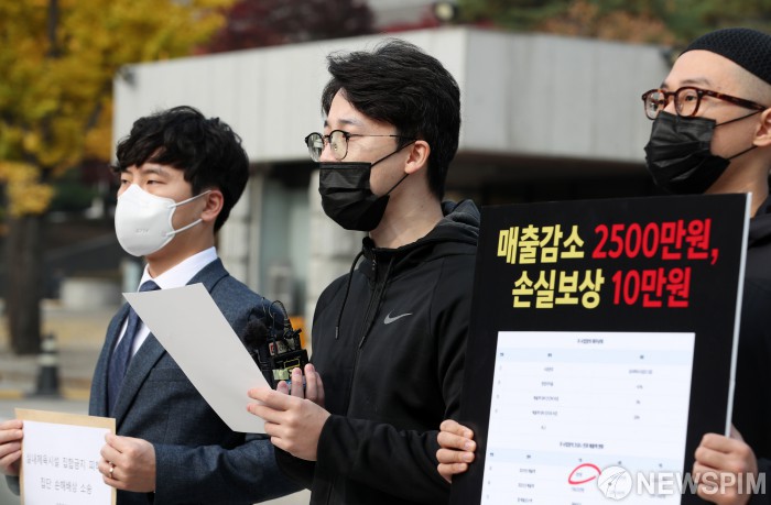 [서울=뉴스핌] 정일구 기자 = 대한실내체육시설 총연합회 관계자들이 4일 오전 서울 서초구 서울중앙지방법원 앞에서 실내체육시설 집합금지 피해자 집단 손해배상 소송 관련 기자회견을 하고 있다. 2021.11.04 mironj19@newspim.com
