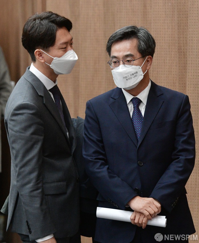[서울=뉴스핌] 이형석 기자 = 김동연 대선 예비 후보가 9일 국회 소통관에서 '2호 공약(미래대비 1호)' 발표를 하기 전 캠프 관계자에게 보고를 받고 있다. 2021.11.09 leehs@newspim.com
