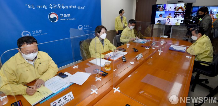 [서울=뉴스핌] 김학선 기자 = 유은혜 사회부총리 겸 교육부 장관이 10일 서울 종로구 정부서울청사에서 열린 '안전한 수능, 수도권 전면등교 준비를 위한 방역점검회의'를 주재하며 모두발언을 있다. 2021.11.10 yooksa@newspim.com