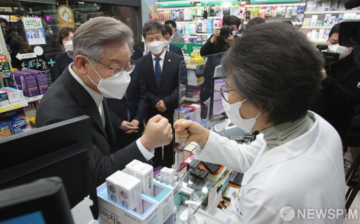 [서울=뉴스핌] 국회사진취재단 = 이재명 더불어민주당 대통령 후보가 17일 서울 망원동 심야약국인 비온뒤숲속약국을 찾아 약사와 인사를 하고 있다. 2021.11.17 photo@newspim.com