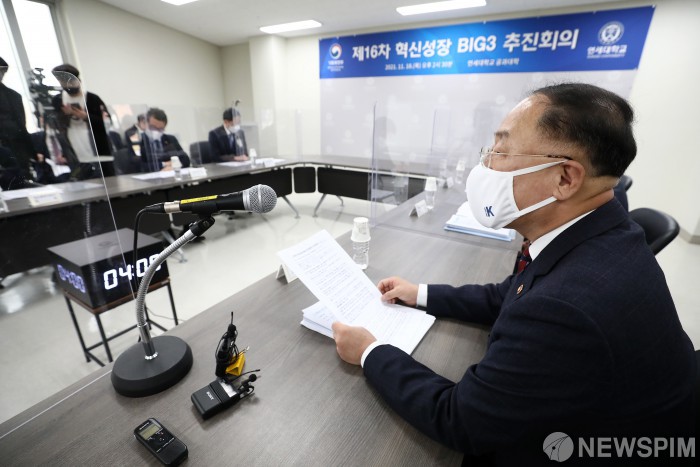 [서울=뉴스핌] 정일구 기자 =홍남기 부총리 겸 기획재정부 장관이 18일 오후 서울 서대문구 연세대학교 제1공학관에서 열린 제16차 혁신성장 BIG3 추진회의에서 모두발언을 하고 있다. 2021.11.18 mironj19@newspim.com