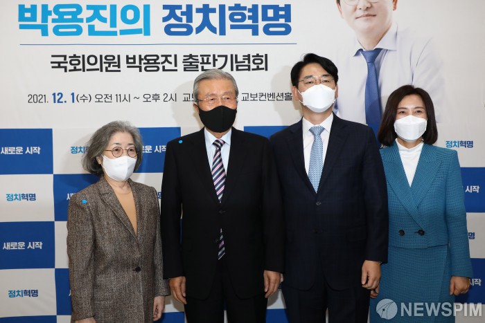 [서울=뉴스핌] 국회사진취재단 = 김종인 전 국민의힘 비상대책위원장과 부인 김미경 이화여대 명예교수가 1일 서울 종로 교보빌딩 컨벤션홀에서 열린 박용진 더불어민주당 의원의 '정치혁명' 출판기념회에 참석해 박 의원 내외와 함께 기념촬영을 하고 있다. 2021.12.01 photo@newspim.com