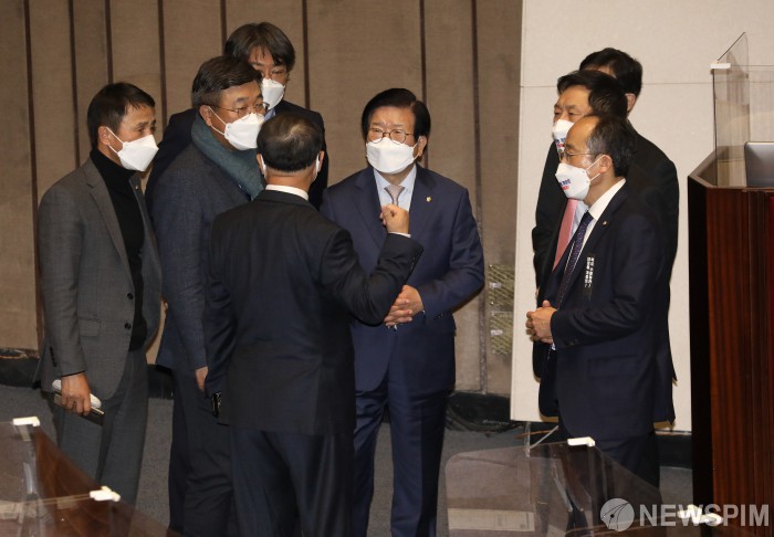 [서울=뉴스핌] 최상수 기자 = 2일 오후 서울 여의도 국회에서 열린 제391회 정기국회 제12차 본회의에서 박병석 국회의장이 새해 예산안 합의 불발로 정회를 선포한 후 윤호중 더불어민주당 원내대표, 김기현 국민의힘 원내대표, 홍남기 경제부총리 겸 기획재정부 장관 등과 대화를 나누고 있다. 2021.12.02 kilroy023@newspim.com